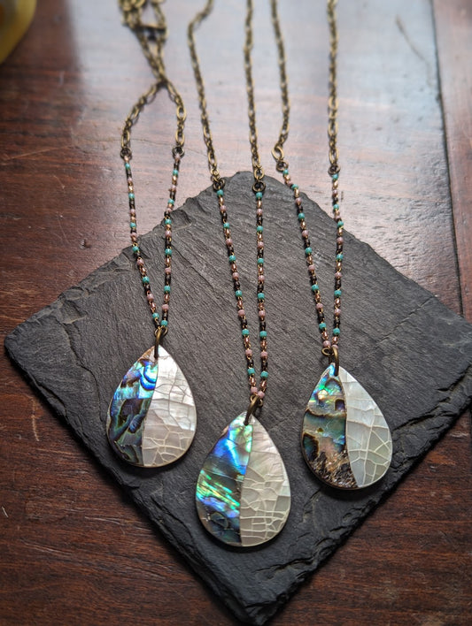 Abalone and Mother of Pearl Tear Drop Brass Necklace