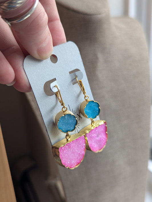 Blue and Pink Druzy Half Moon Circle Gold Hoops