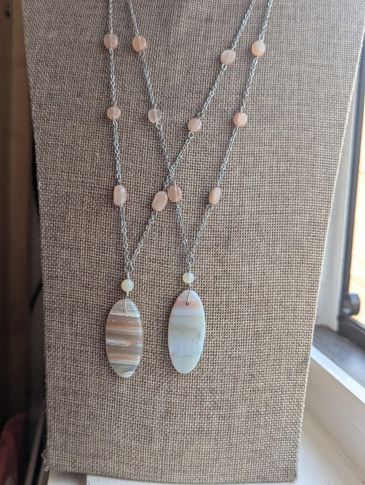 Pink Botswana Agate and Peach Moonstone Silver Stainless Necklace