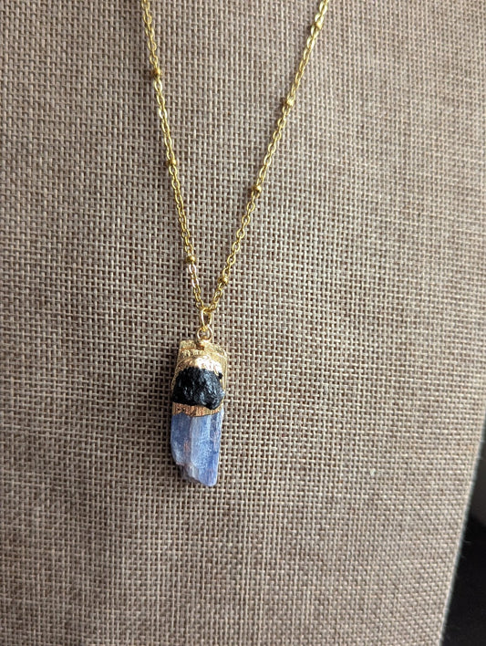 Raw Kyanite and Black Tourmaline Gold Long Necklace