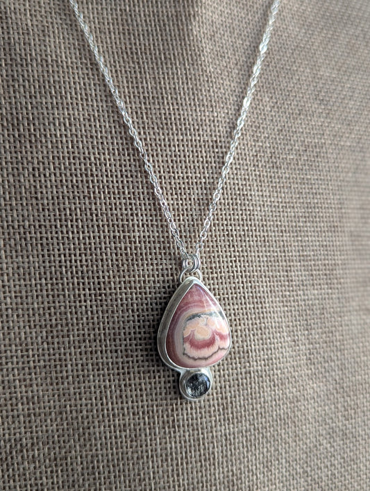 Rhodocrosite Teardrop and Black Tourmaline Quartz Silver Necklace