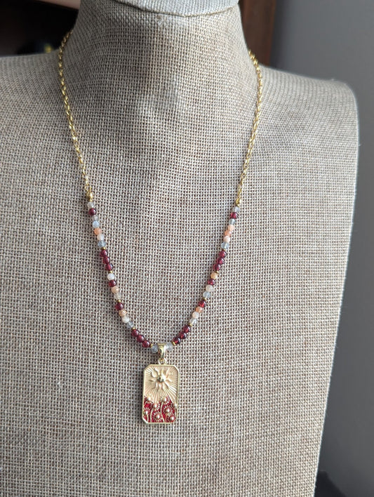 Garnet and Peach Moonstone Flower Sunshine Gold Necklace