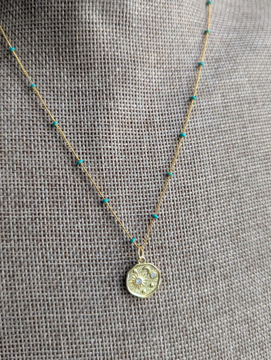 Sun Moon Stars Gold and Turquoise Necklace