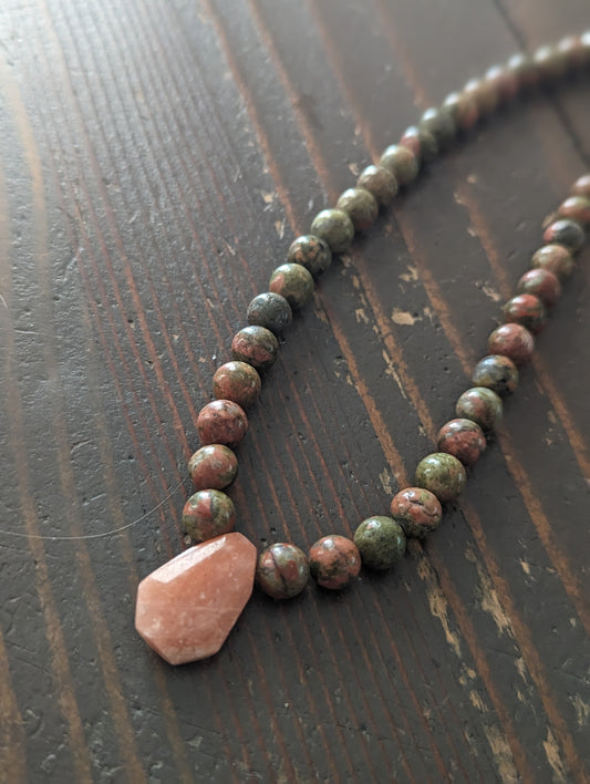 Collar llamativo de aventurina rosa, piedra lunar color melocotón y ágata rosa de Botsuana