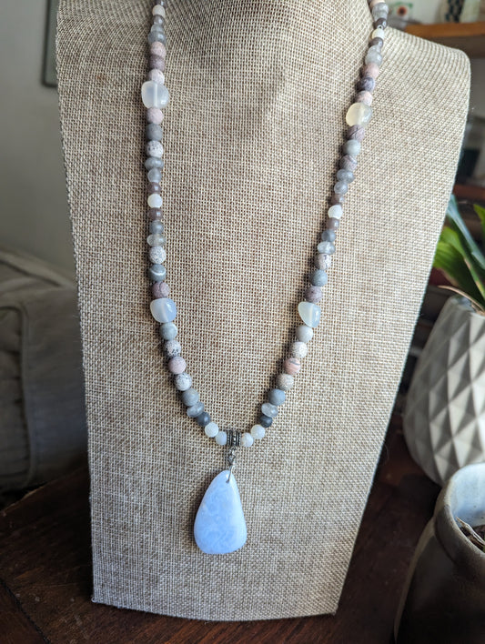 Collar llamativo de jaspe artístico y ágata de encaje azul