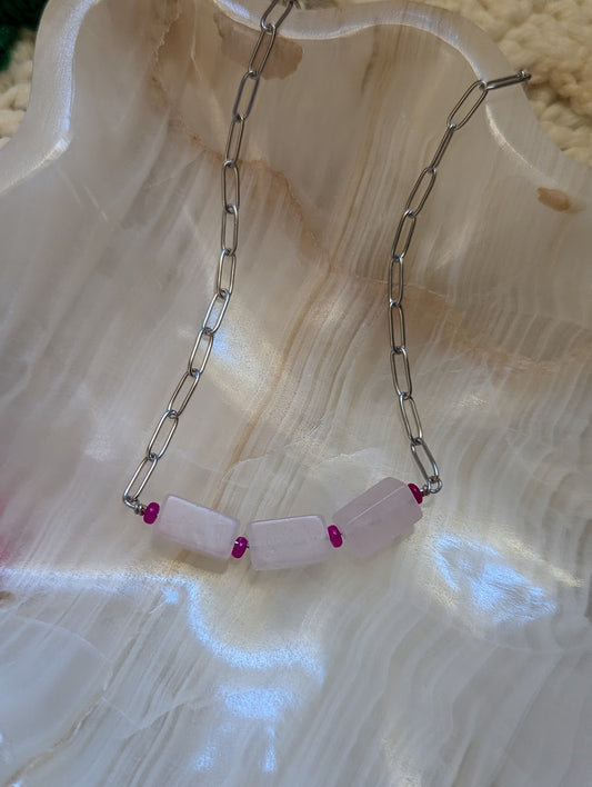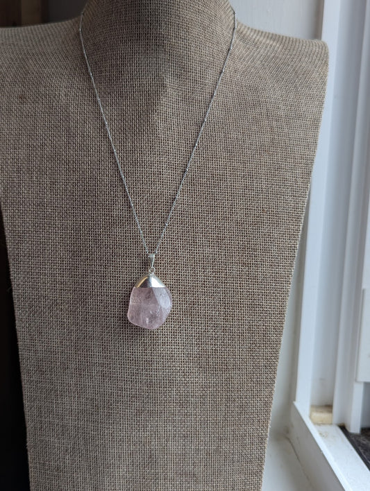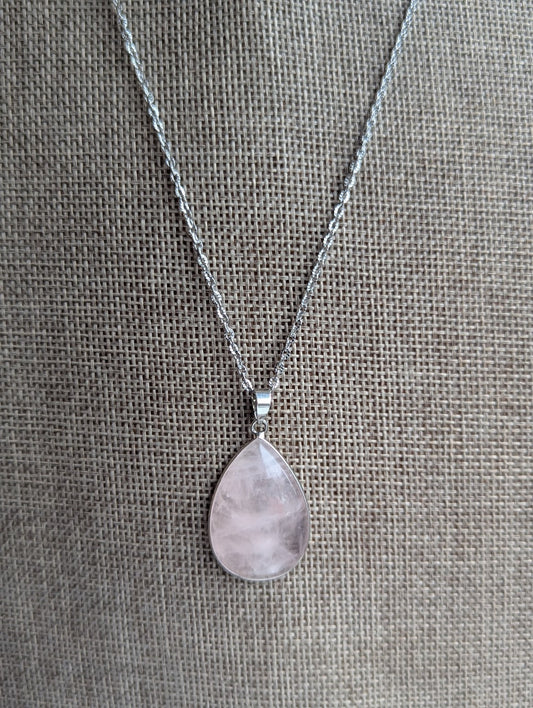 Large Rose Quartz Teardrop Silver Stainless Necklace