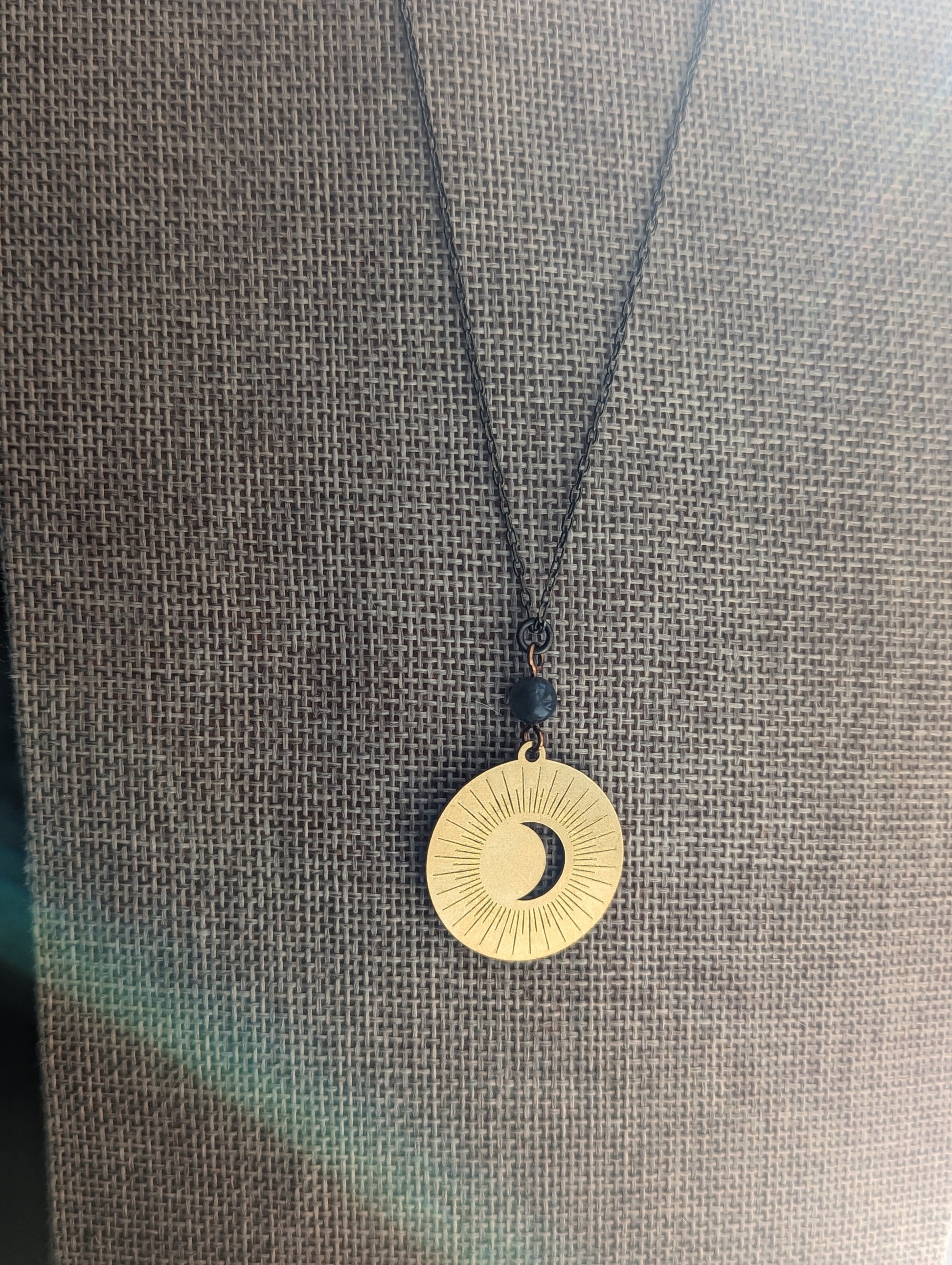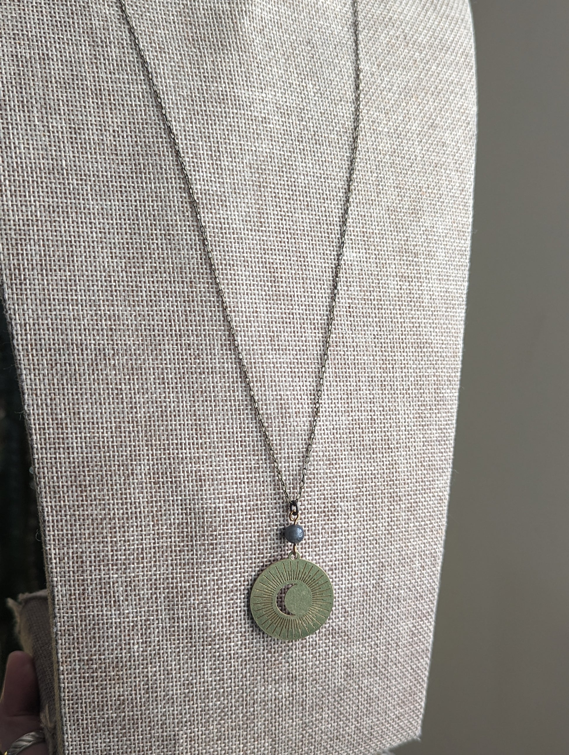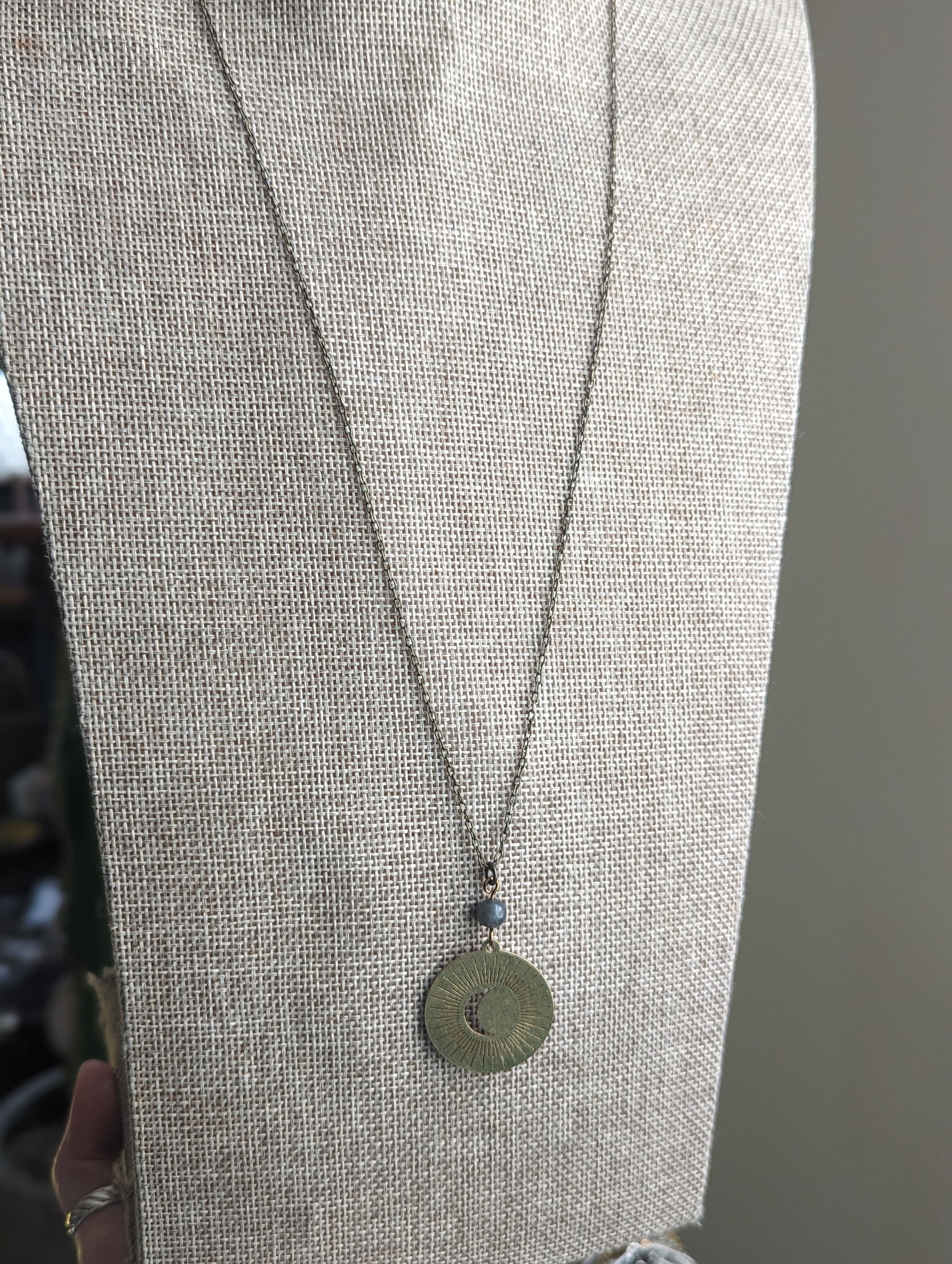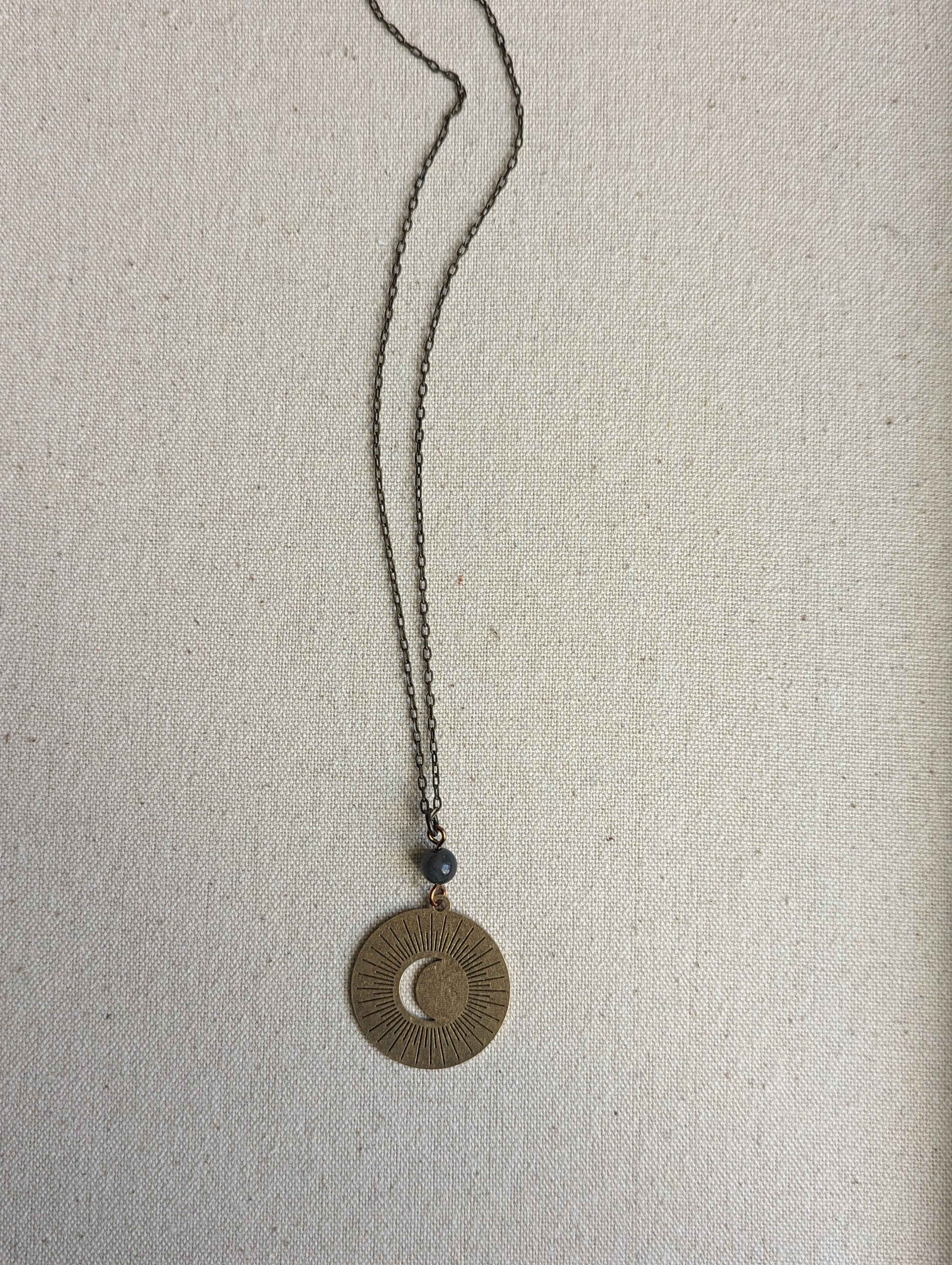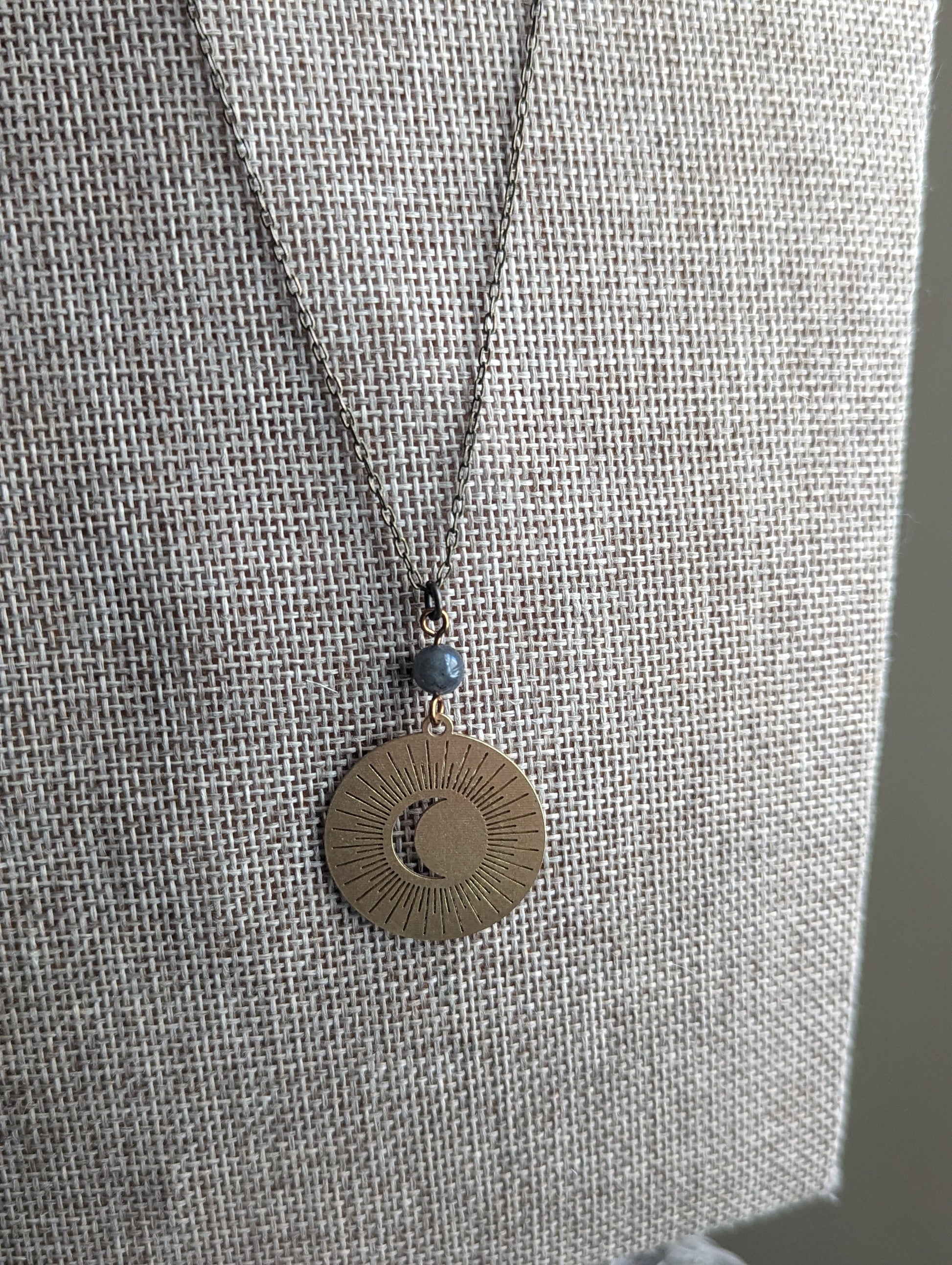 - Talismán de latón con diseño de luna creciente y rayo de luz con cuenta con acento de labradorita.