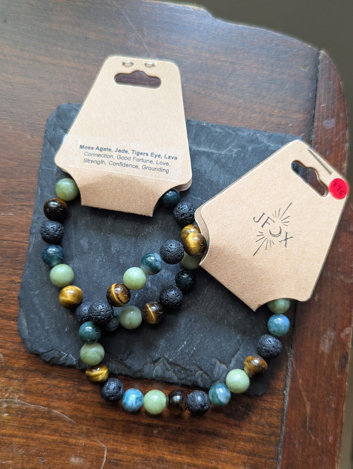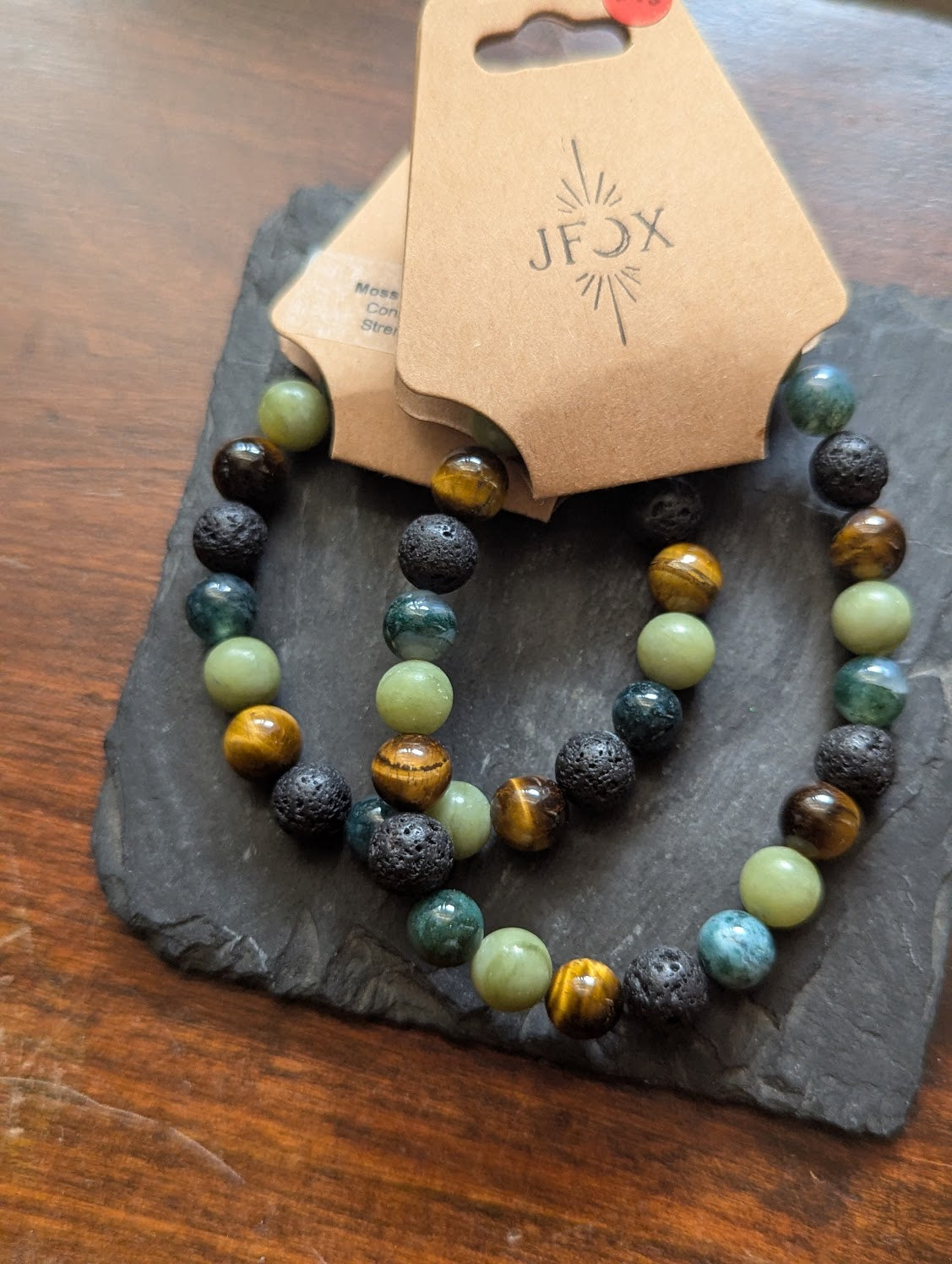 - A blend of earthy tones of green moss agate, jade, lava rock and tigers eye gemstones