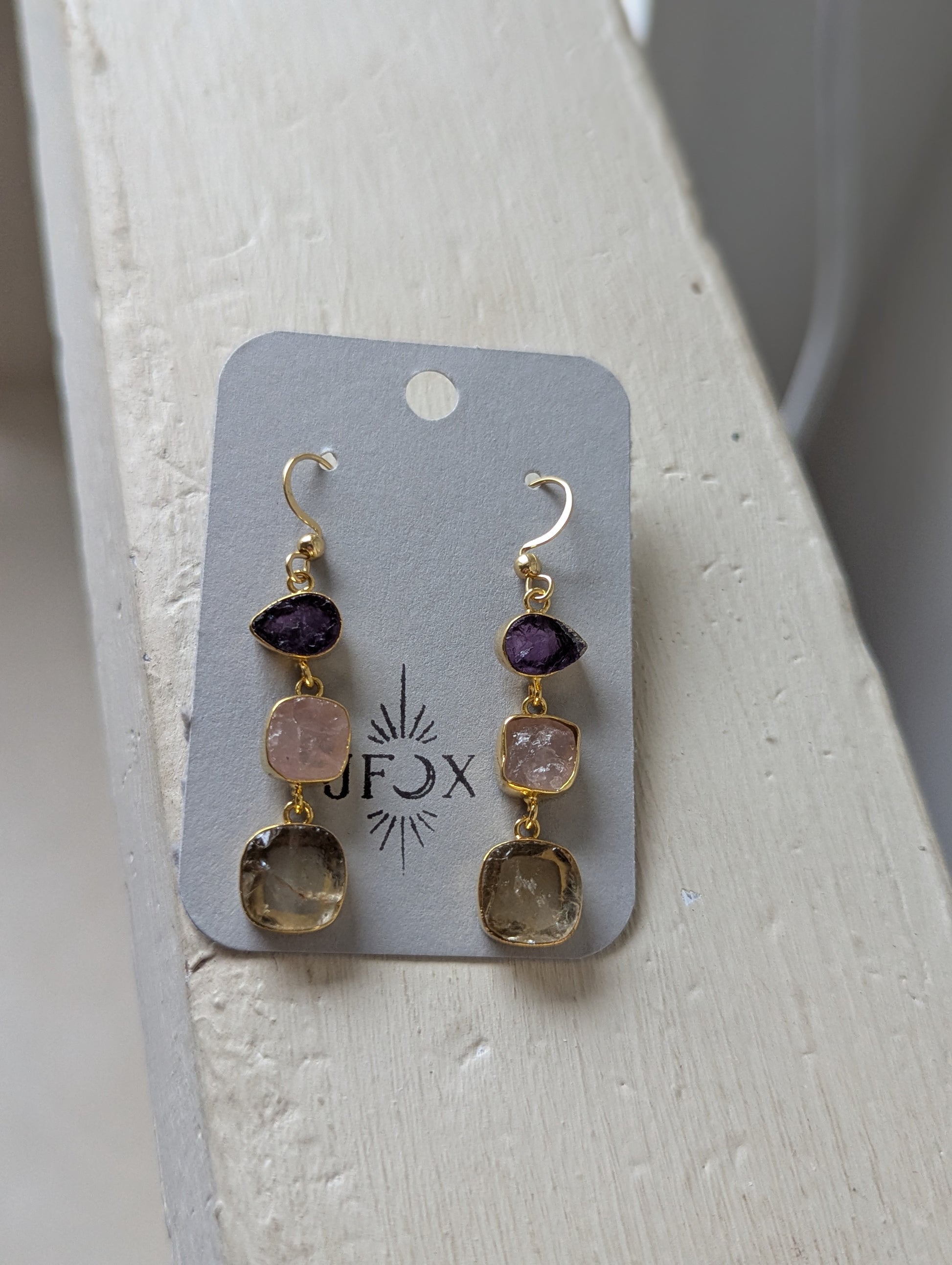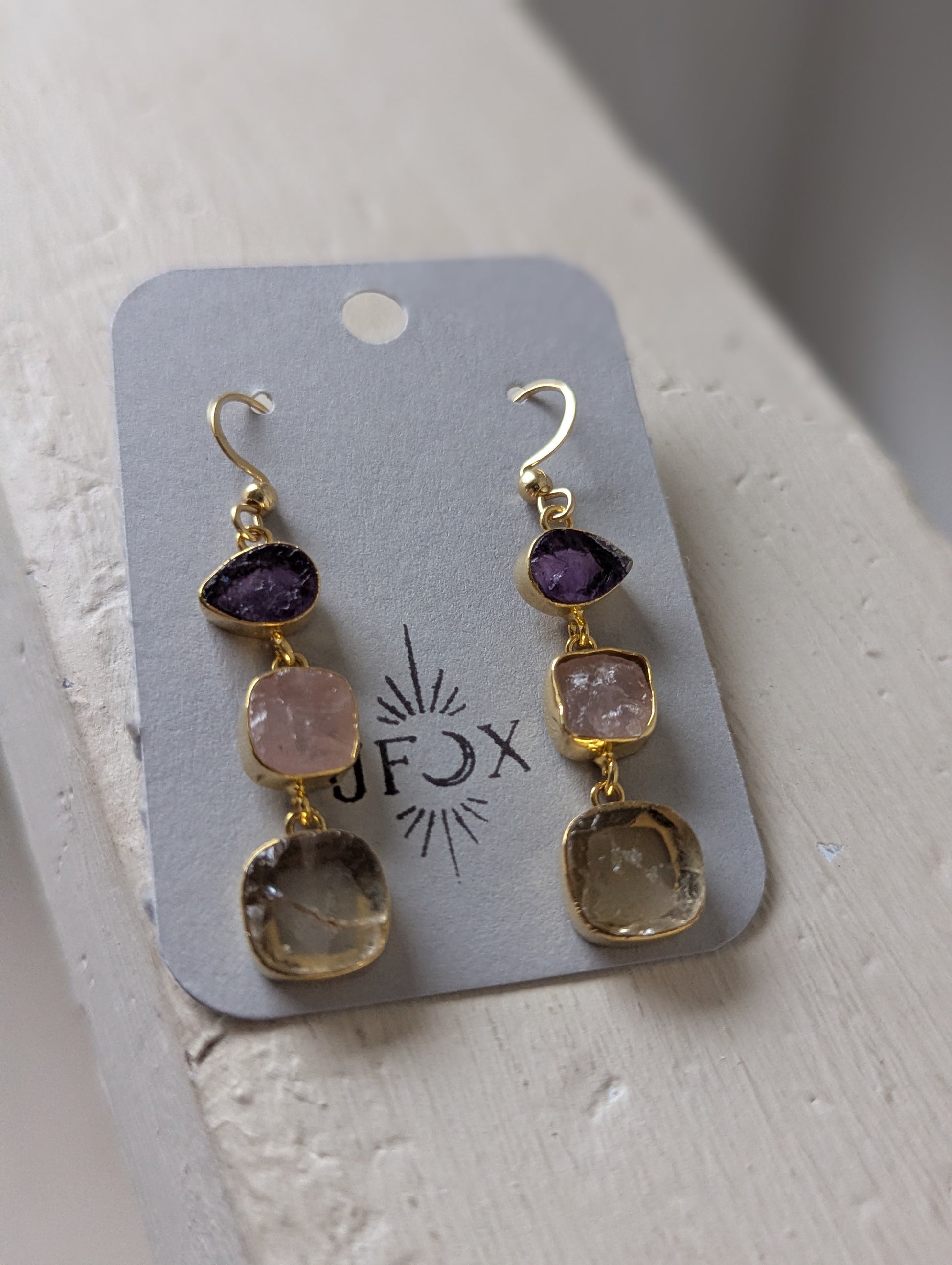 - Raw gemstone trios including amethyst, citrine, rose quartz, strawberry quartz