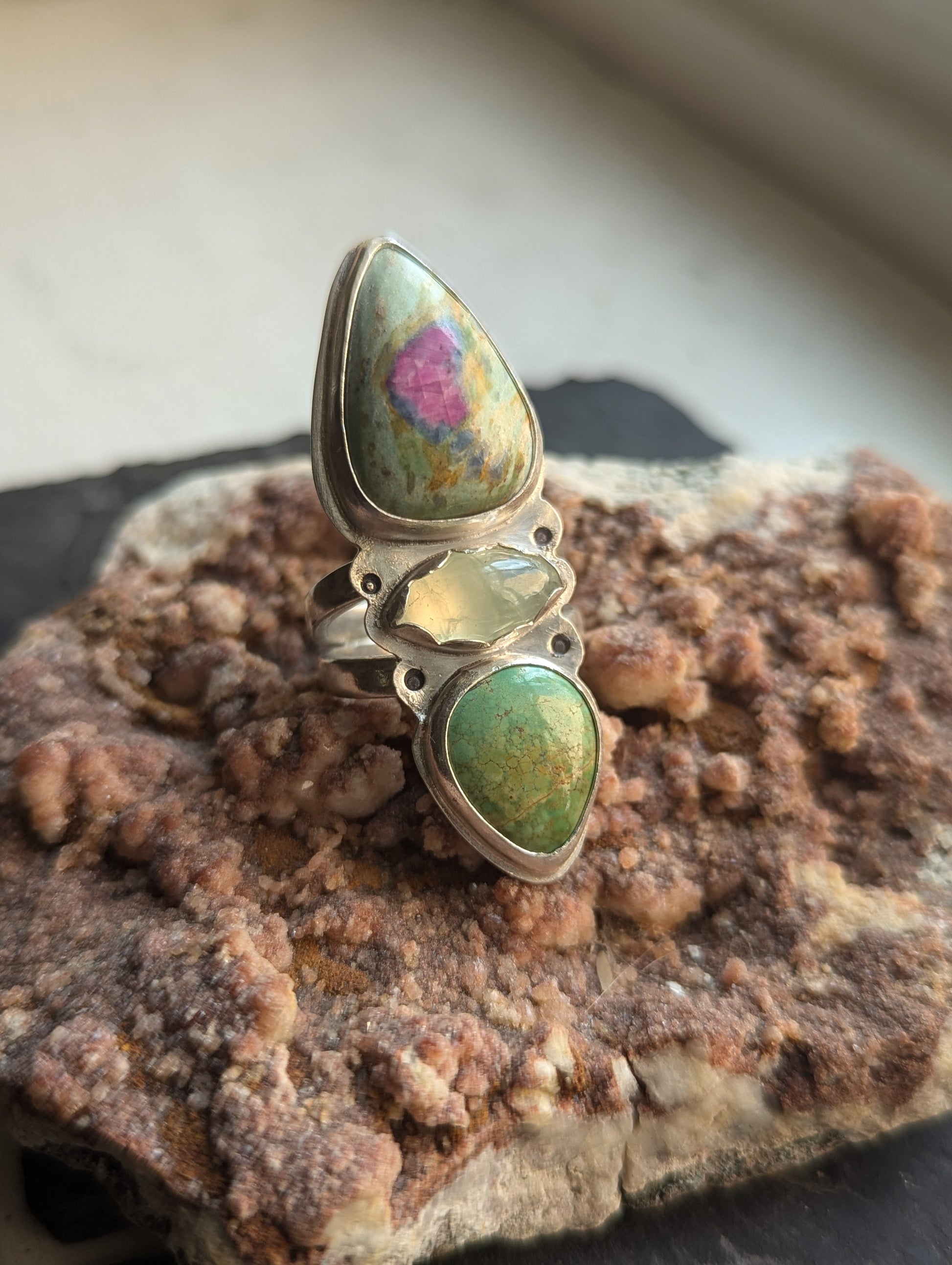 Anillo de plata de ley con rubí, fucsita, prehnita y turquesa - Talla 9