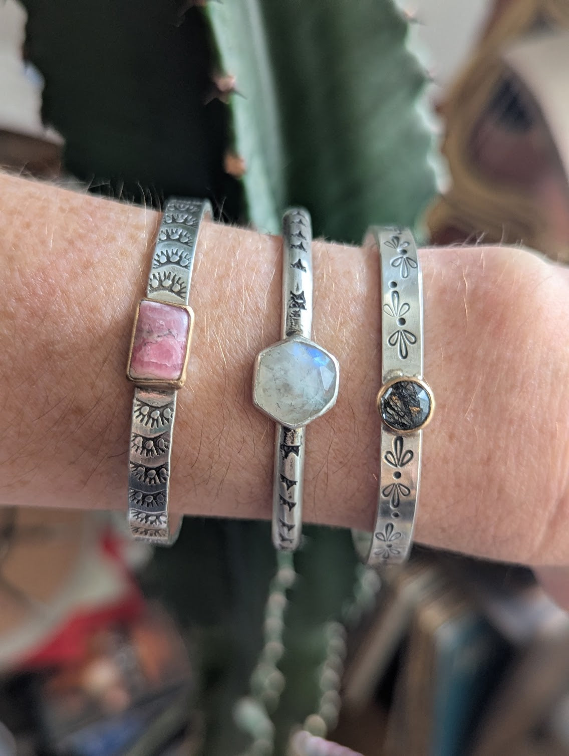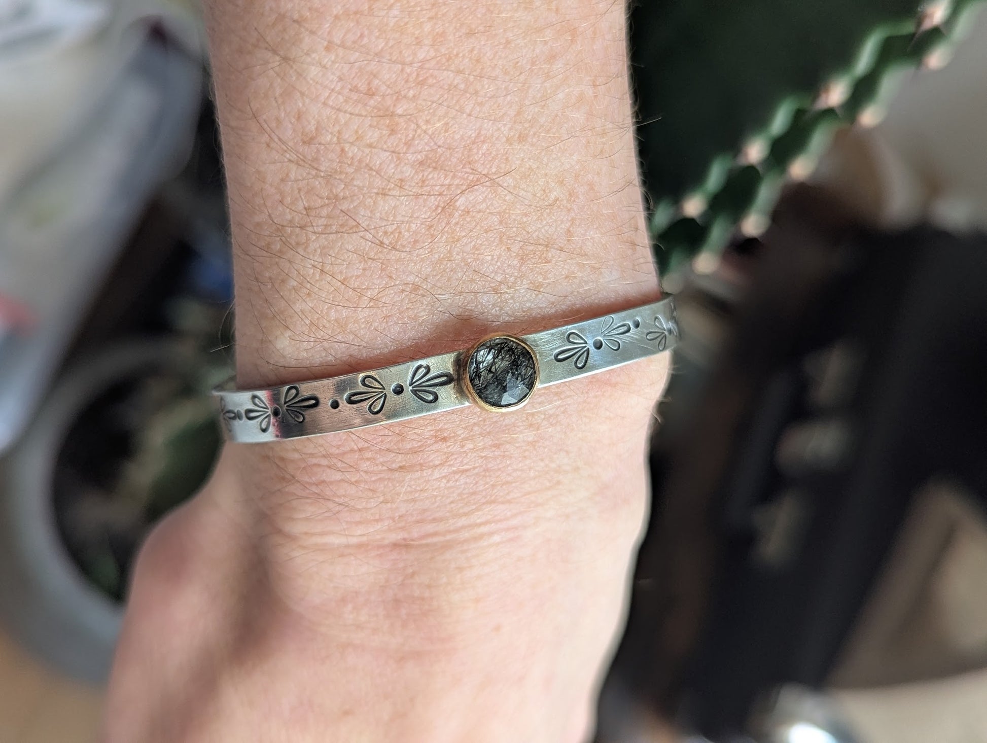 Black Rutile Quartz Gold and Silver Stamped Mixed Metal Cuff