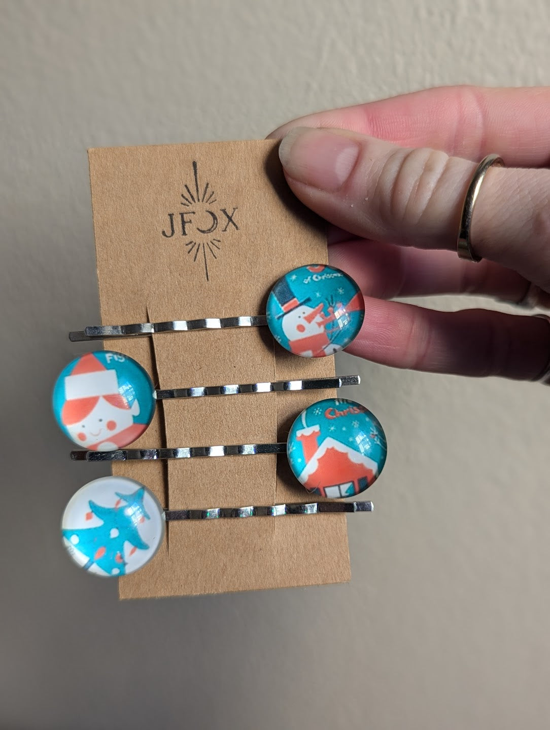 - Each set of 4 bobby pins will be a variety of vintage Christmas themed designs such as: Angel, Snowman, Christmas tree, Cozy Cottage, Elf, etc.