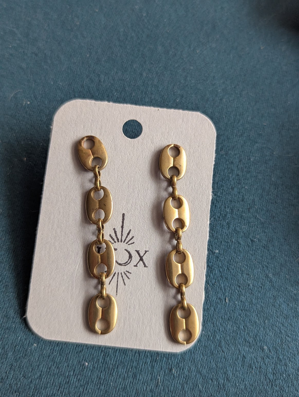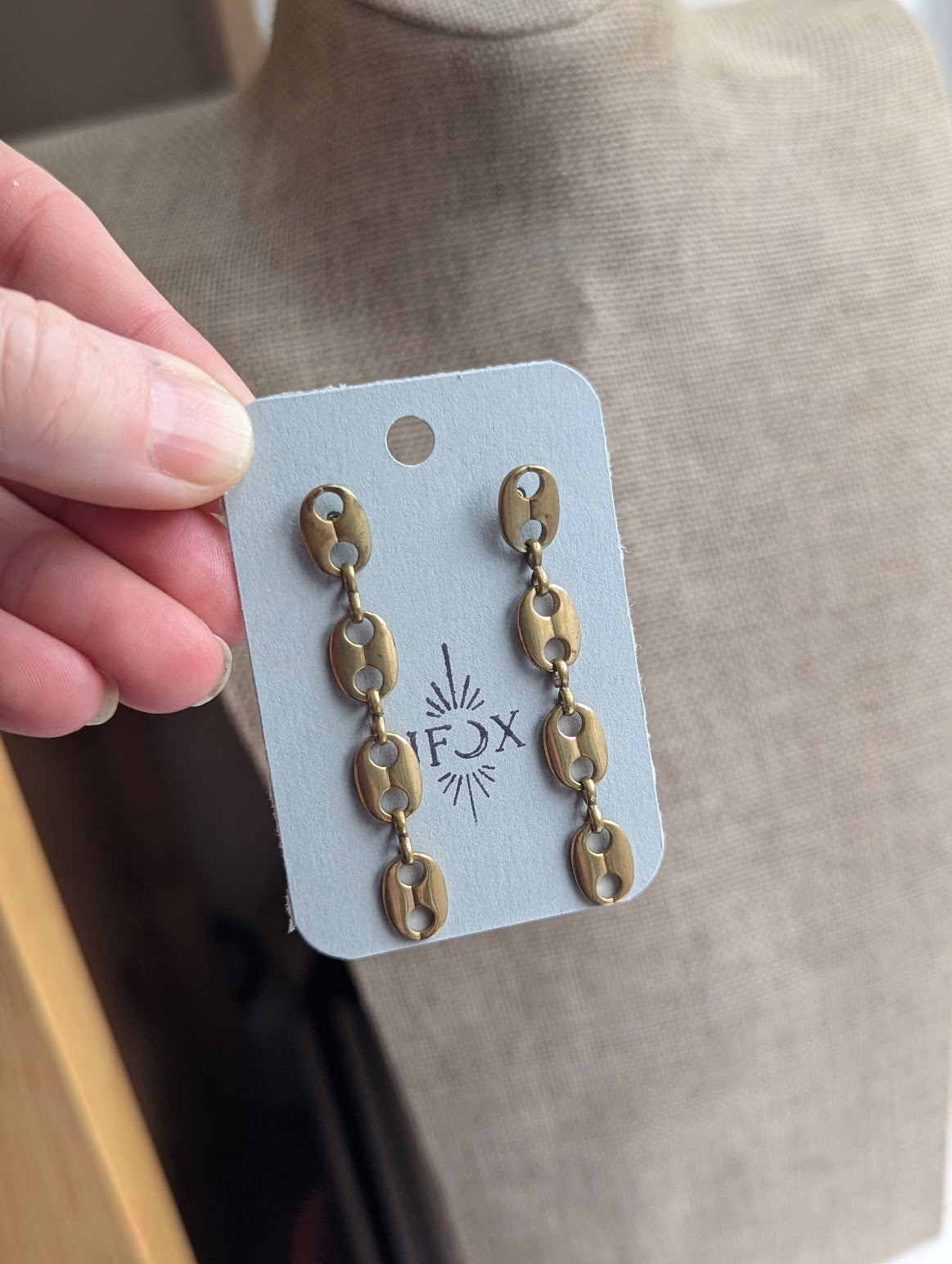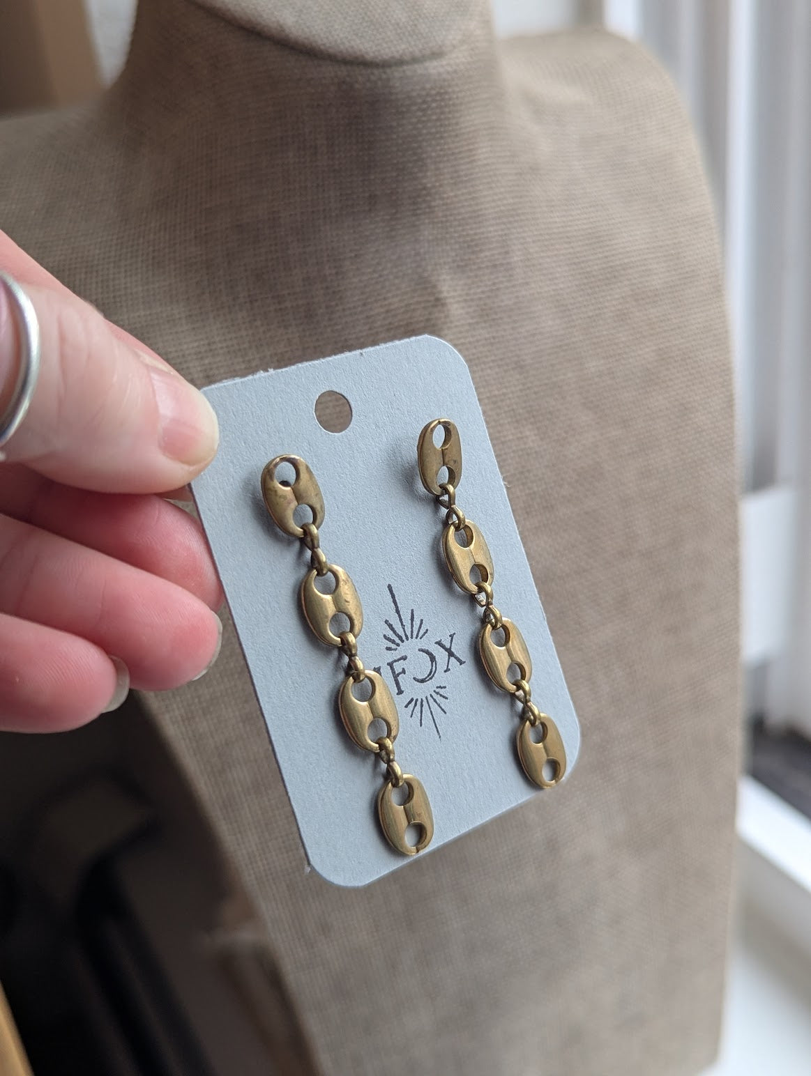 - Stainless steel, hypoallergenic posts with brass chain drop designs