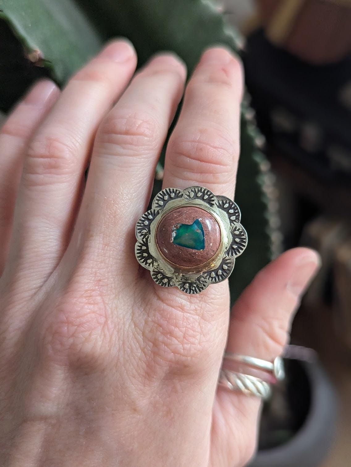 - Unique and stunning cantera fire opal in the center of the JFOX favorite floral design