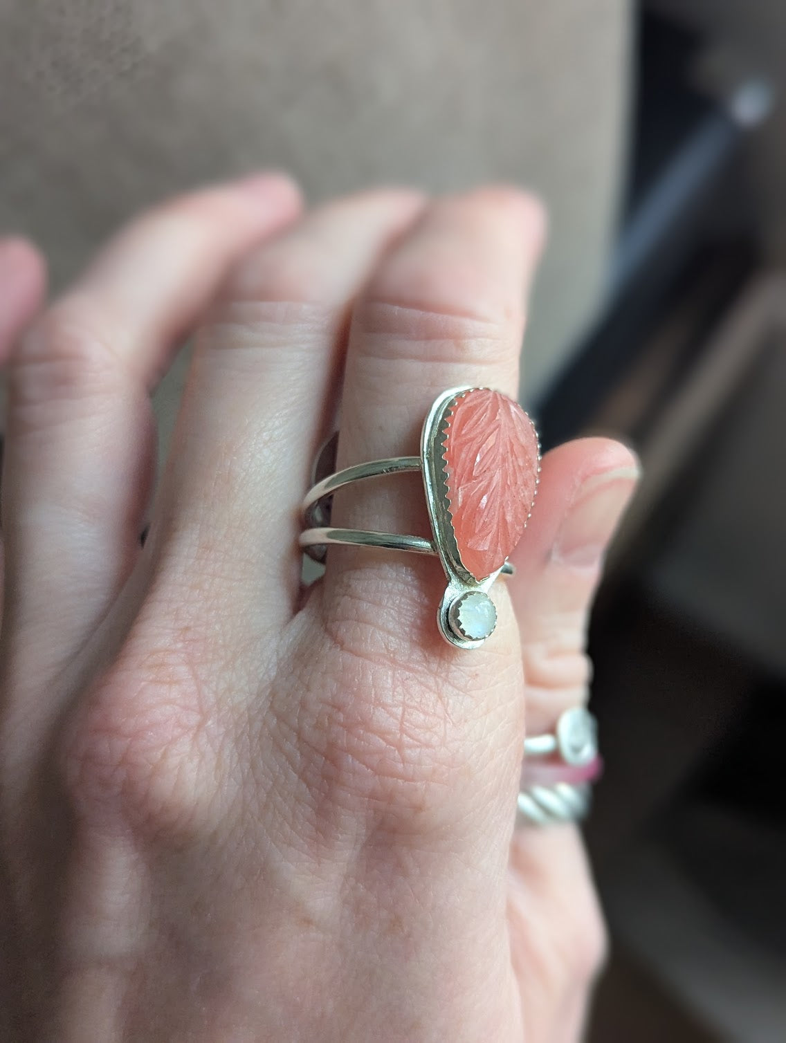 - Hand carved leaf design in a beautiful pink rhodonite and an accent moonstone