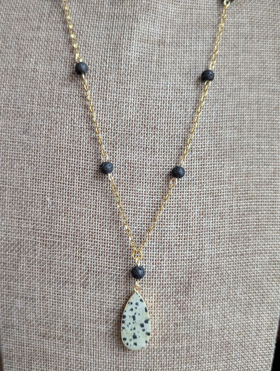 - Dalmatian jasper tear drop pendant with hand wire-wrapped lava beads into the gold chain