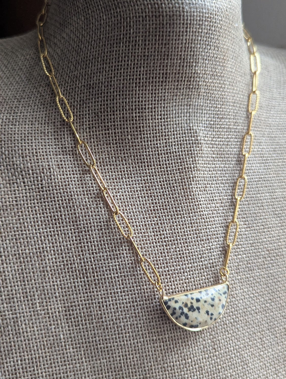 Dalmatian Jasper Half Moon Gold Paper Clip Necklace