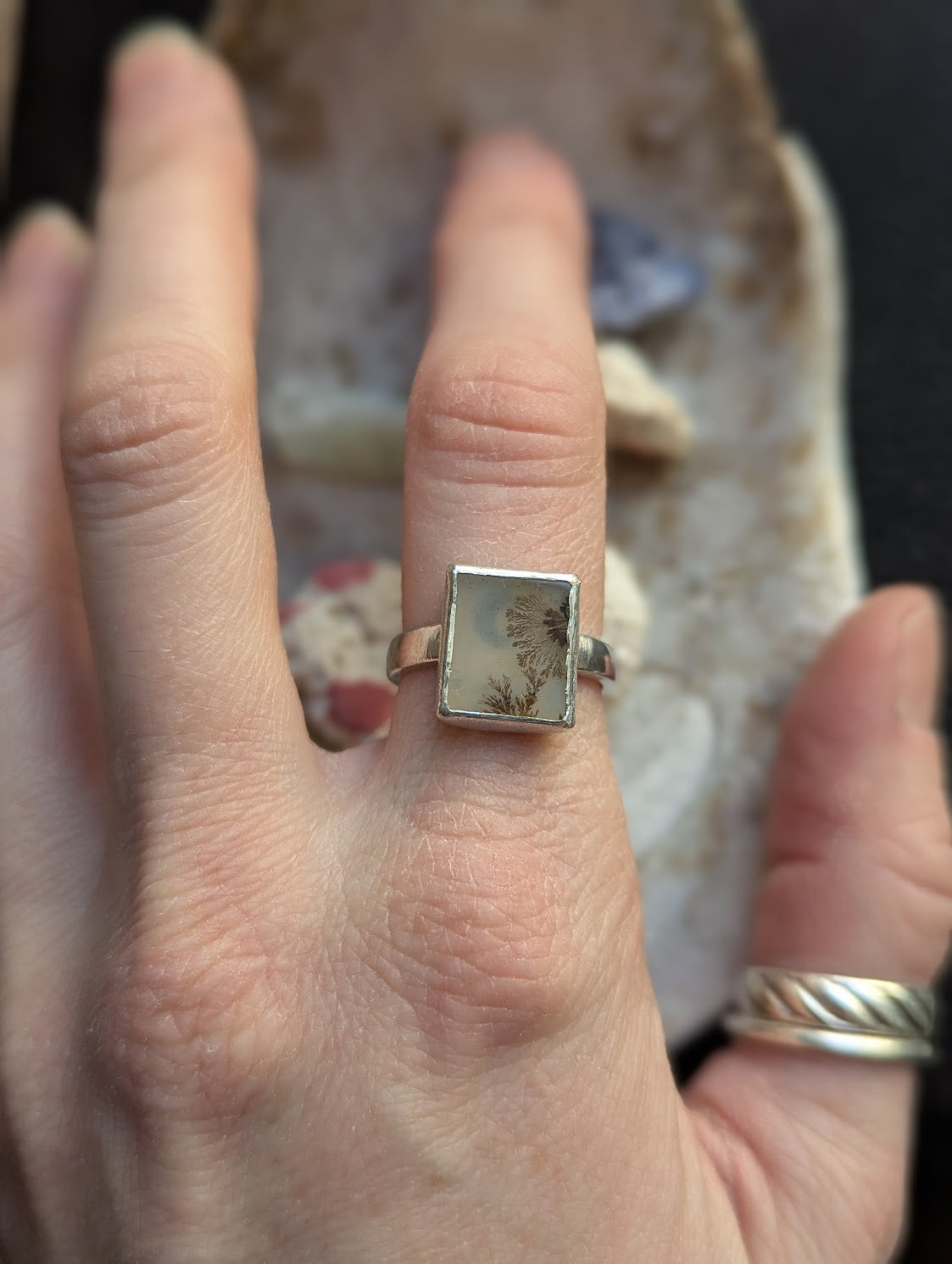 Dendritic Agate Moon Rectangle Silver Ring - Size 7
