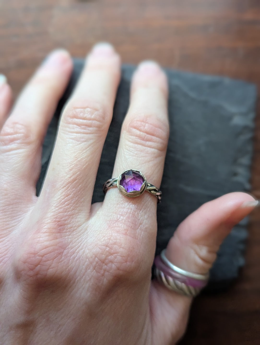 Faceted Round Amethyst Braided Band Sterling Ring - Size 9