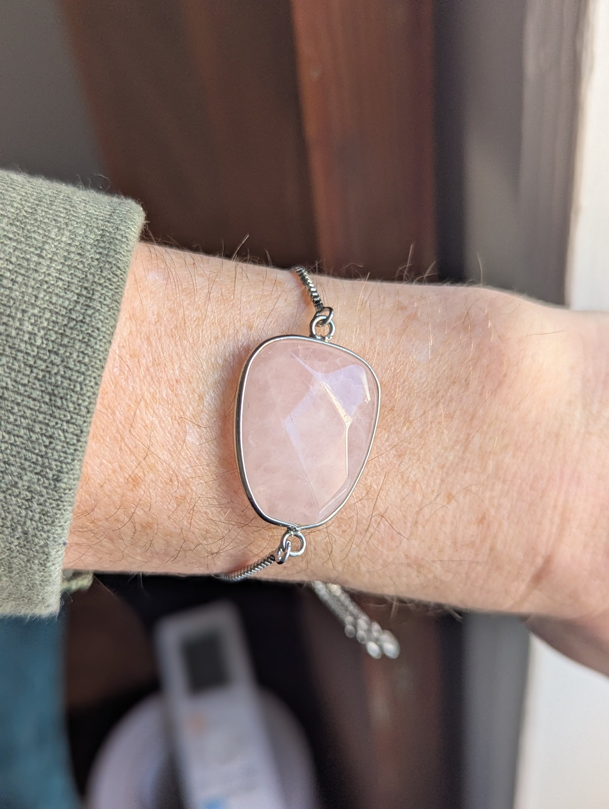 Large Faceted Rose Quartz Silver Slider Bracelet
