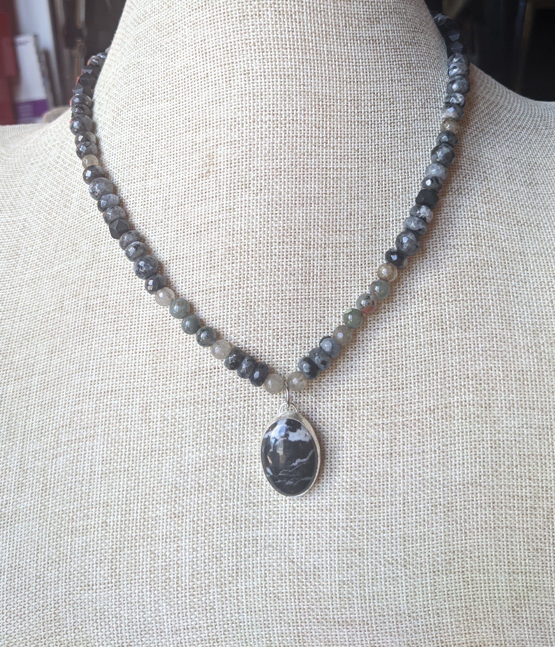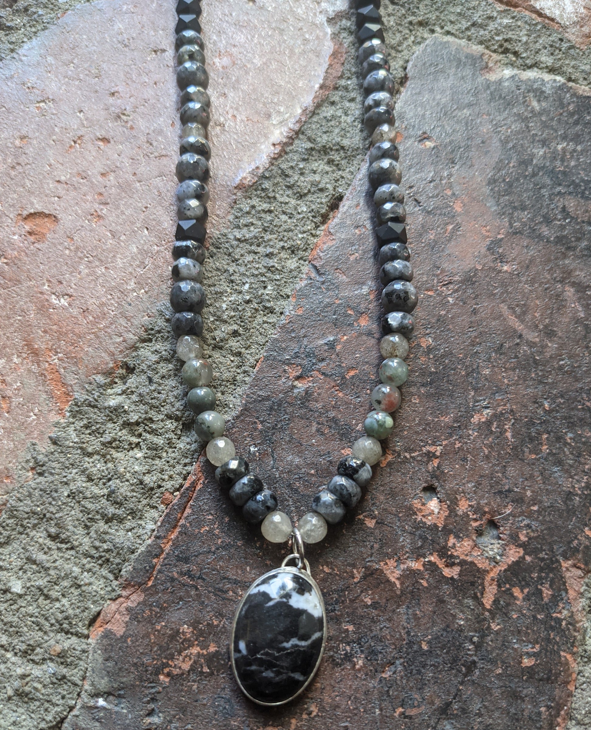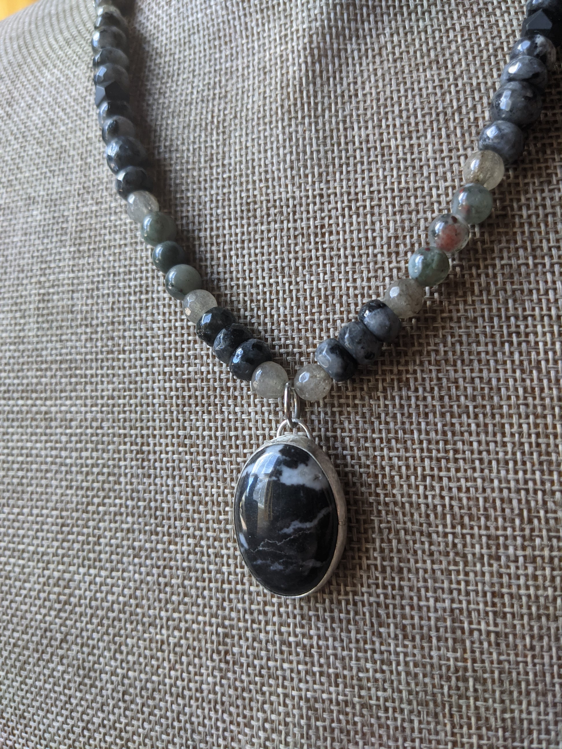 Sterling Silver Larvikite Labradorite and Onyx Short Statement Necklace