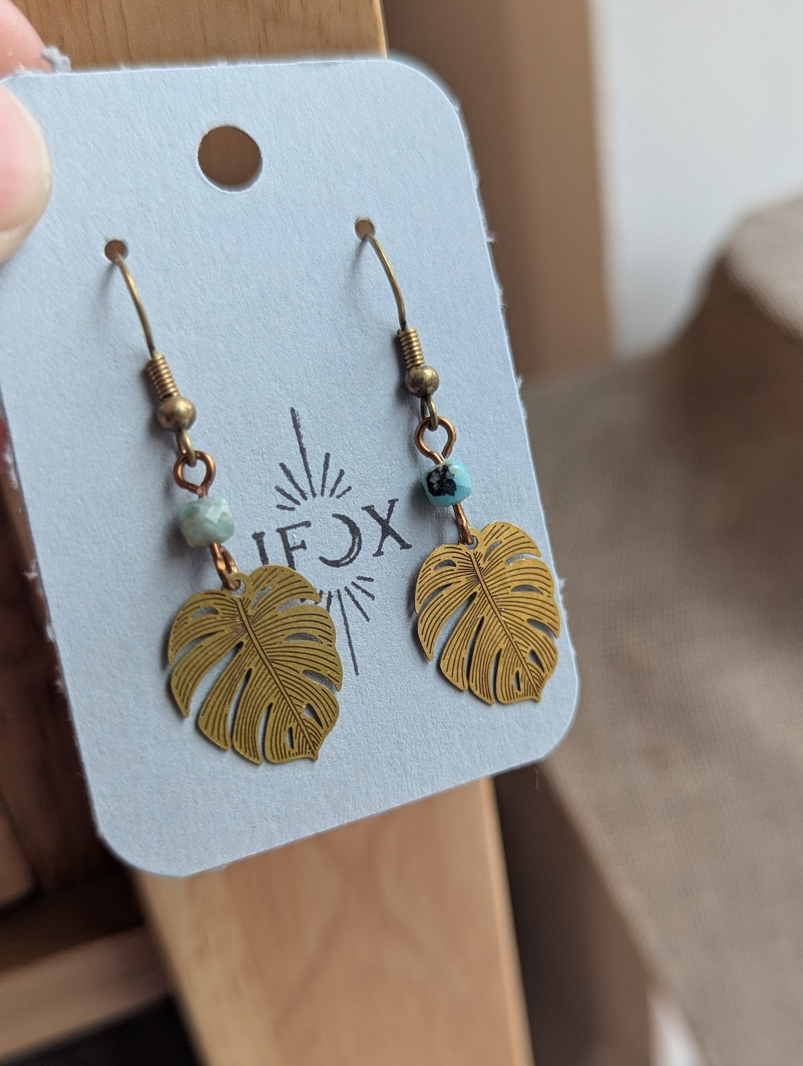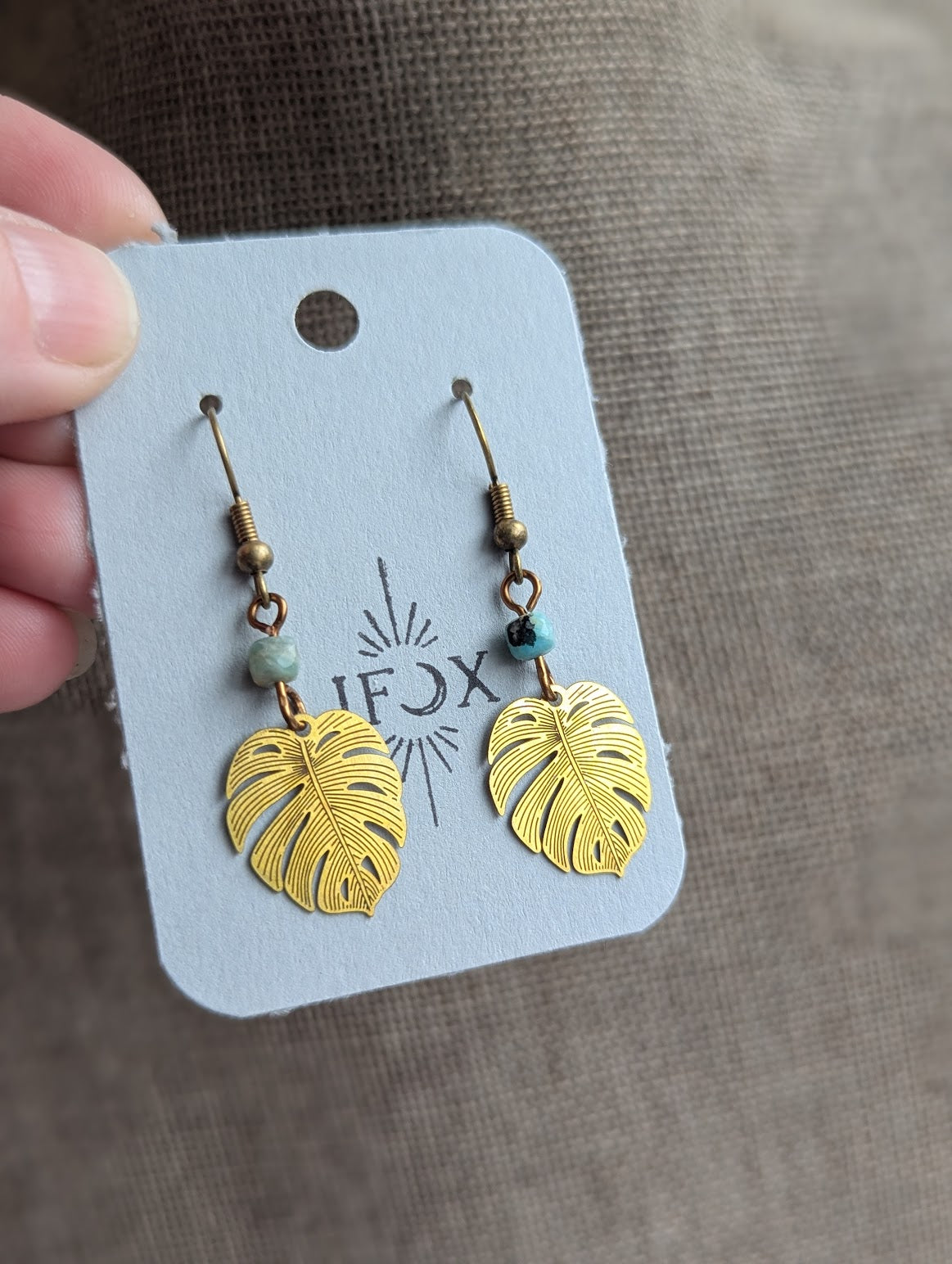 - Laser cut brass metal monstera leaf design with Amazonite accents