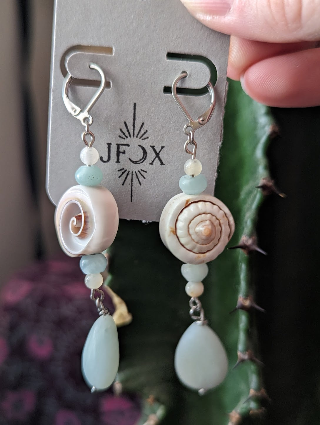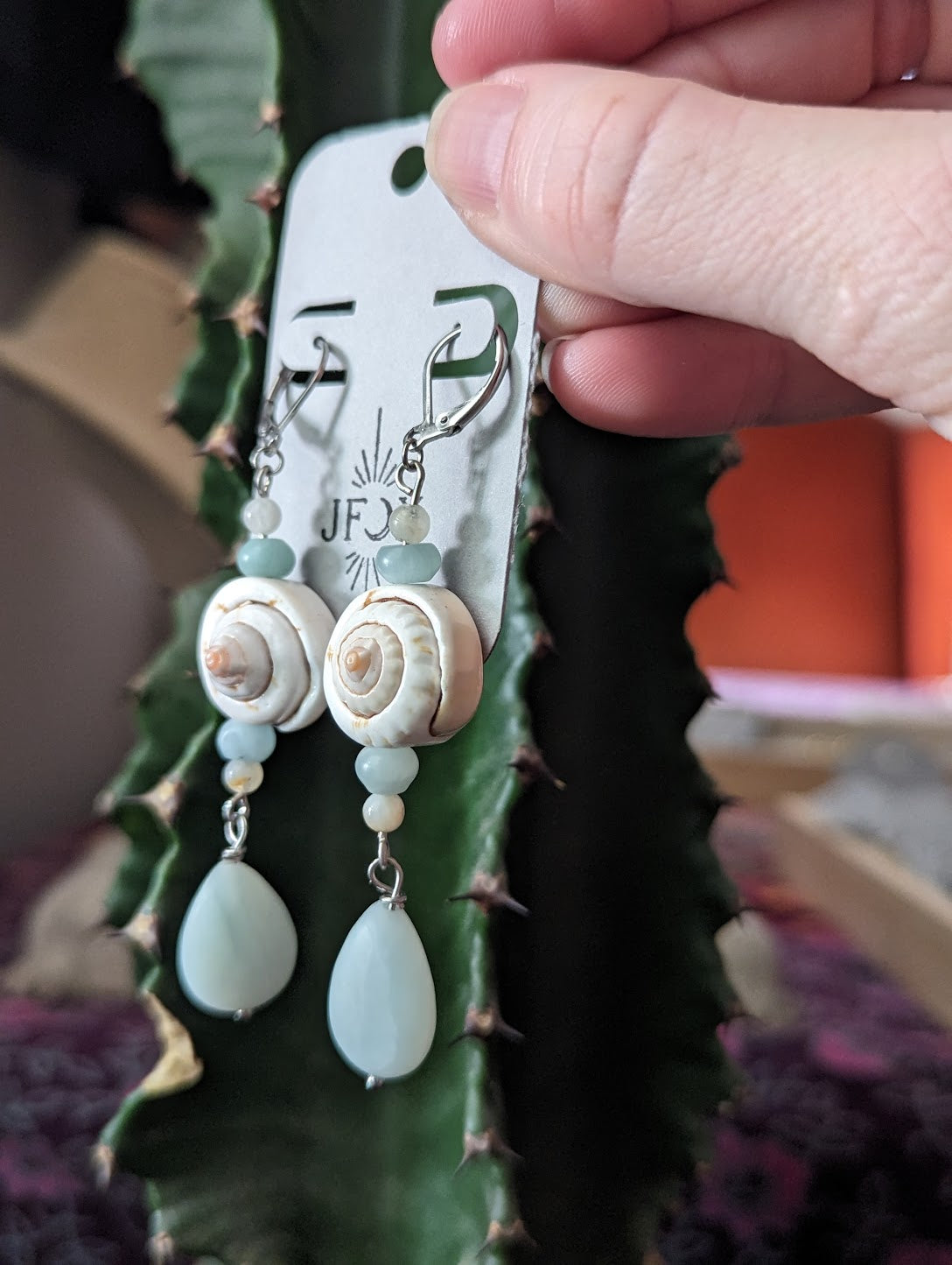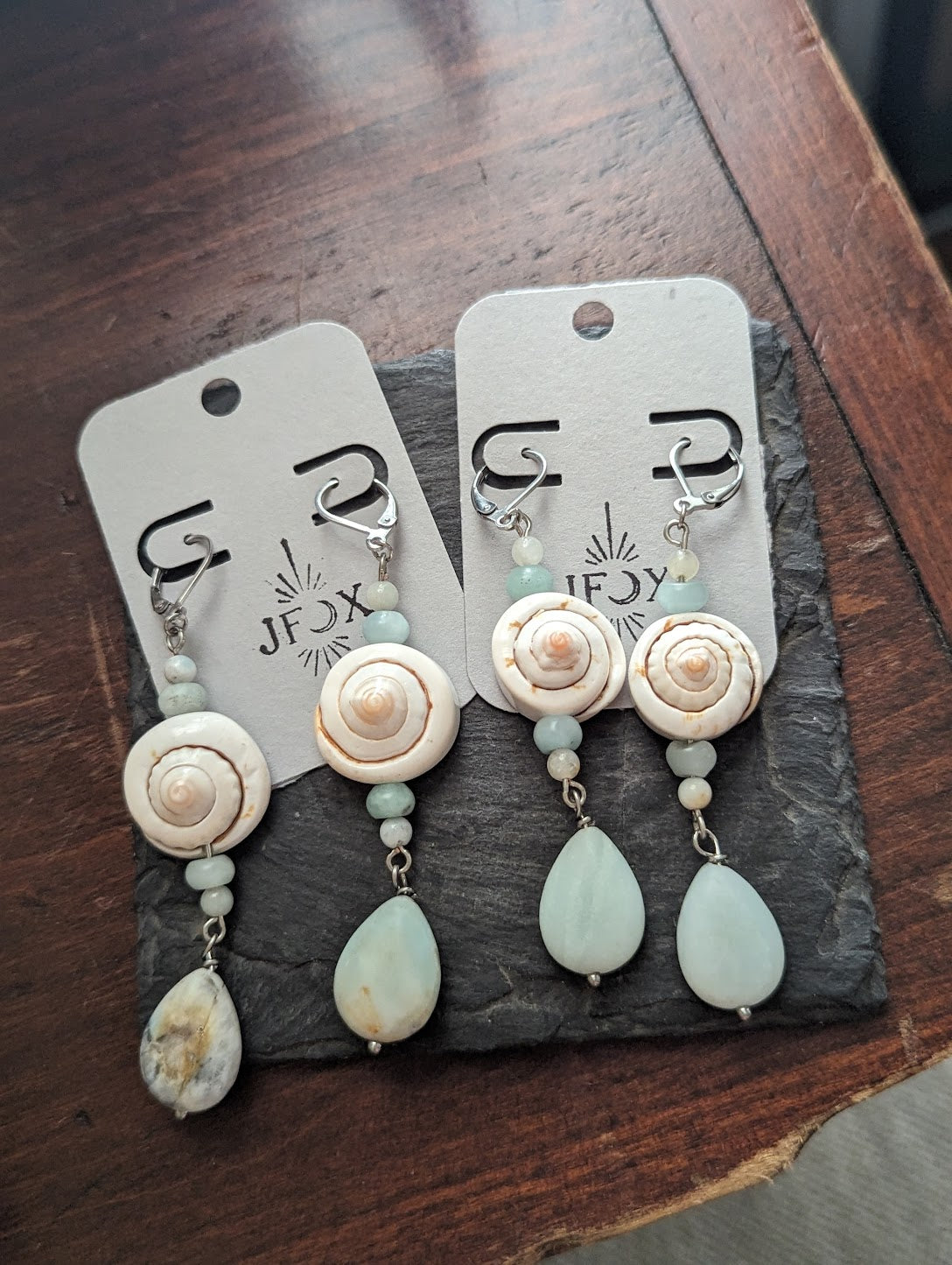 - Beachy vibe amazonite beads and tear drop with a spiral shell focal point