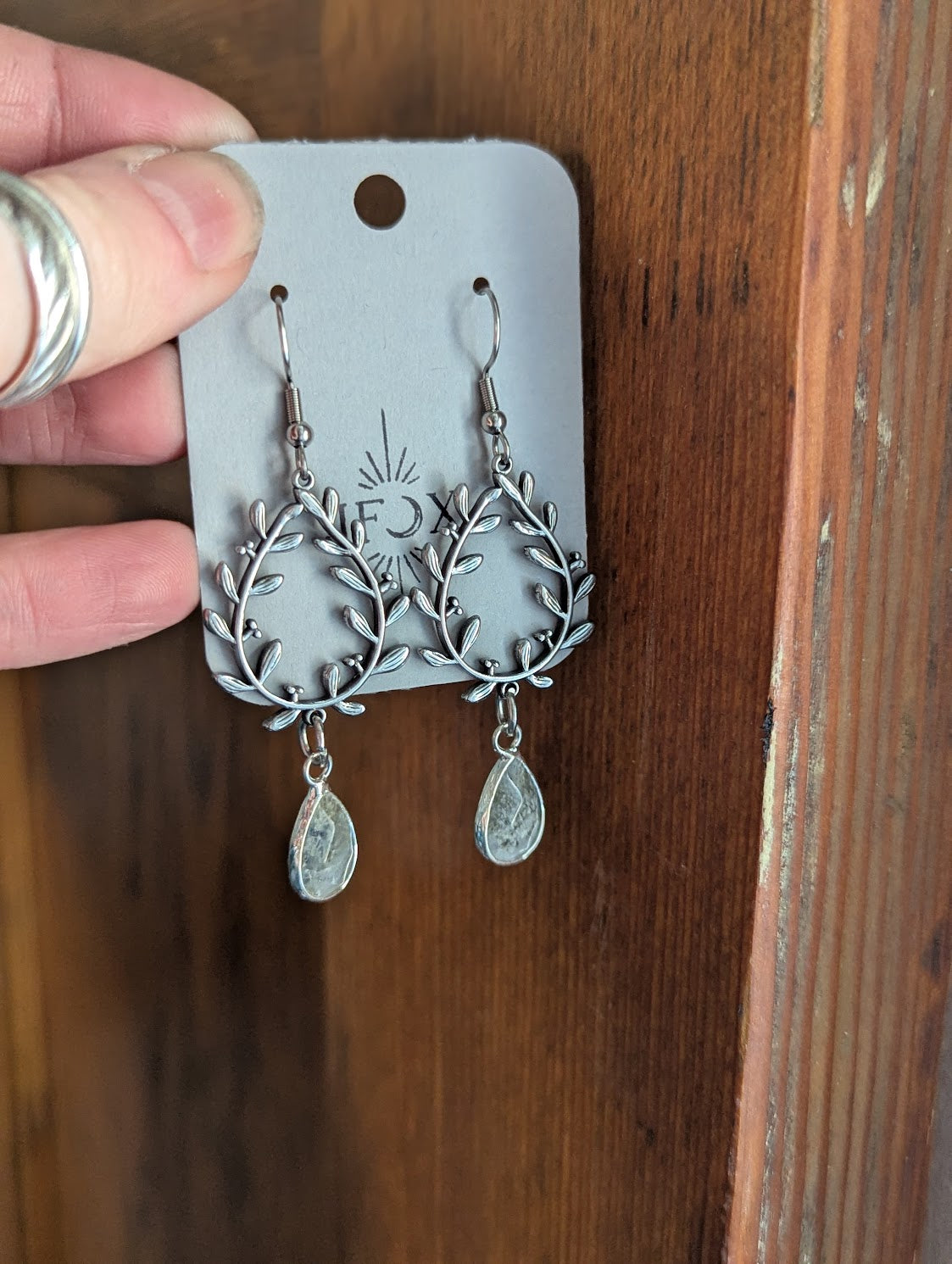 - Stainless steel laurel wreath tear drop design earrings with gemstone tear drop accent drops