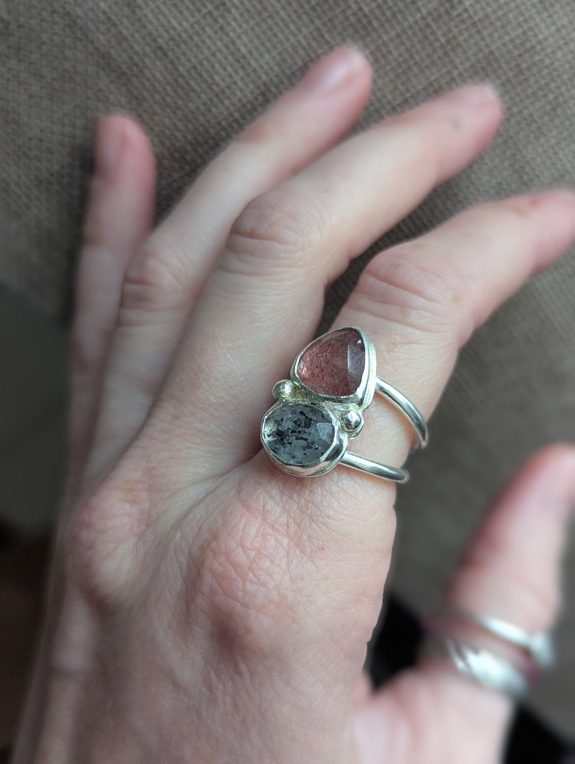 Strawberry Quartz and Dot Rutile Quartz Silver Ring - Size 6