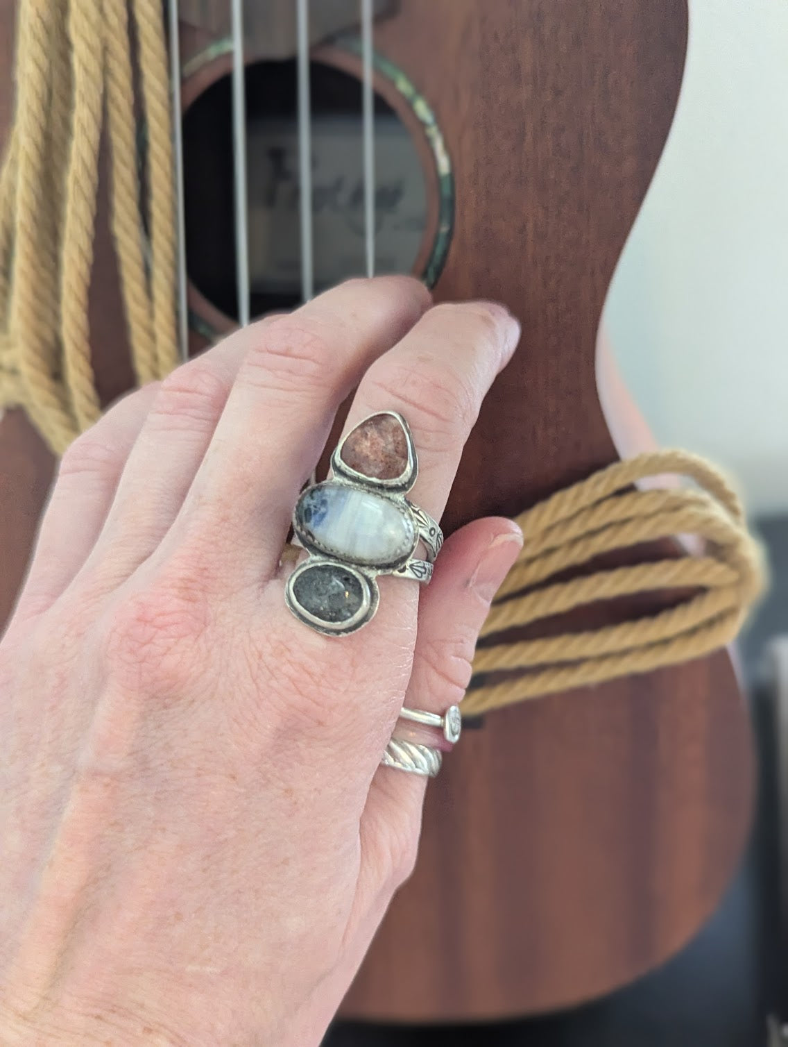 Strawberry Quartz, Moonstone, Dot Rutile Quartz Silver Trio RIng - Size 8