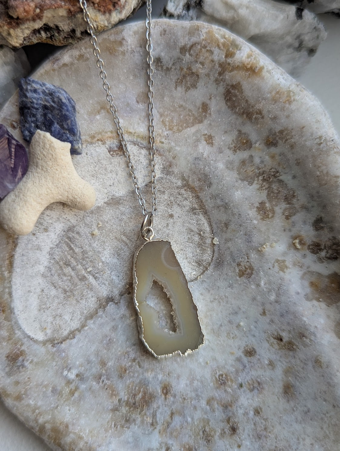 - Yellow agate slice with silver electroplating around the raw edge with a shimmering druzy center
